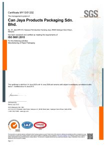 Can Jaya with the consistent endeavors in manufacturing products packaging as well as high level of target enable us to entitle with the following certificate that granted base on the satisfactory surveillance audits.